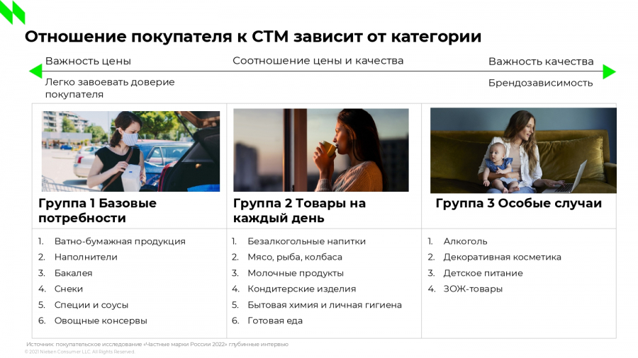 В покупательском исследовании NielsenIQ «Частные марки России 2022» отмечается, что в отдельных случаях более низкие цены на СТМ не являются ключевым фактором при покупке товаров. Например, небольшая стоимость не учитывается в категориях алкоголя, декоративной косметики и детского питания, где более низкий ценовой индекс частных марок уступает высокой лояльности покупателей отдельным брендам, указывают аналитики компании.