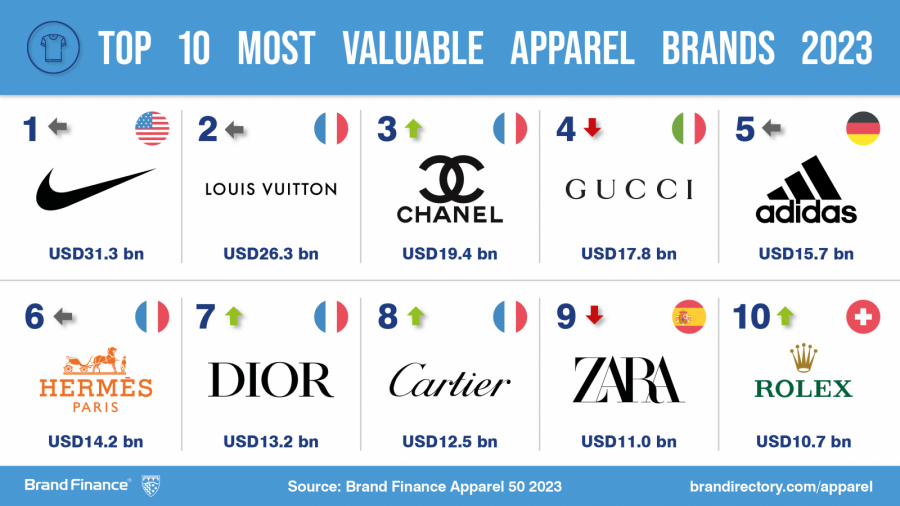 Третья строчка ещё у одного люксового бренда из Франции — Chanel. Он показал уверенный рост в 27%, до $19,39 млрд, вытеснив на четвёртое место Gucci — итальянского производителя одежды, парфюмерии, аксессуаров и текстиля класса «люкс».