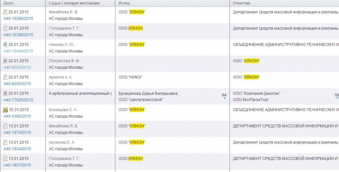 Компания «Илион», структура рекламного оператора «Никэ», подала заявление о признании банкротом. Рассматривать заявление будет Арбитражный суд Москвы. Кроме того, в январе столичный арбитраж зарегистрировал пять исков «Илиона» к департаменту СМИ и рекламы и два иска - к Объединению административно-технических инспекций (ОАТИ) города Москвы.