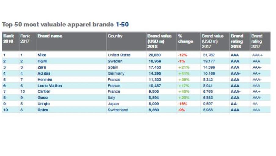 Hermès, Louis Vuitton, Cartier и Gucci заняли соответственно пятое, шестое, седьмое и восьмое места. Аналитики отмечают, что Hermès удалось обогнать лидеров рынка за счет внимательного отношения к клиентам и успешного позиционирования. Cartier, поднялся с прошлогоднего 10 места и обошёл в этом рейтинге Rolex почти на целых 3,5 миллиарда долларов. Швейцарская часовая компания оценивается в 6,4 миллиарда долларов и занимает десятое место в рейтинге. На девятой строчке расположилась компания Uniqlo.