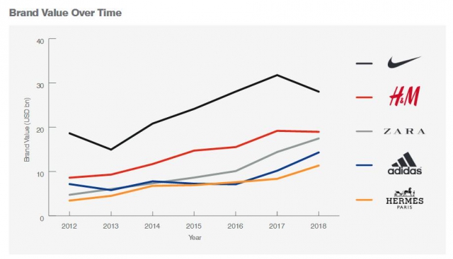 Вторую строчку в этом списке занимает H&M со стоимостью в 19 миллиардов долларов, третью — Zara, постепенно сокращающая разрыв с лидером. Основной конкурент американского бренда спортивной одежды, adidas, занимает четвертую позицию в рейтинге, его стоимость около 14 миллиардов долларов.