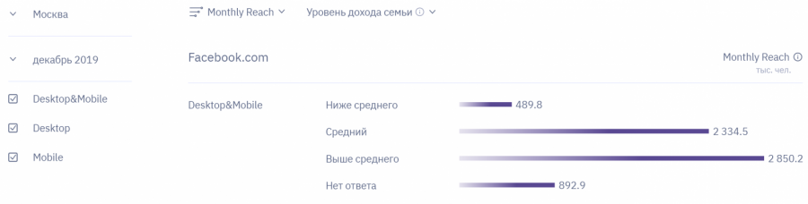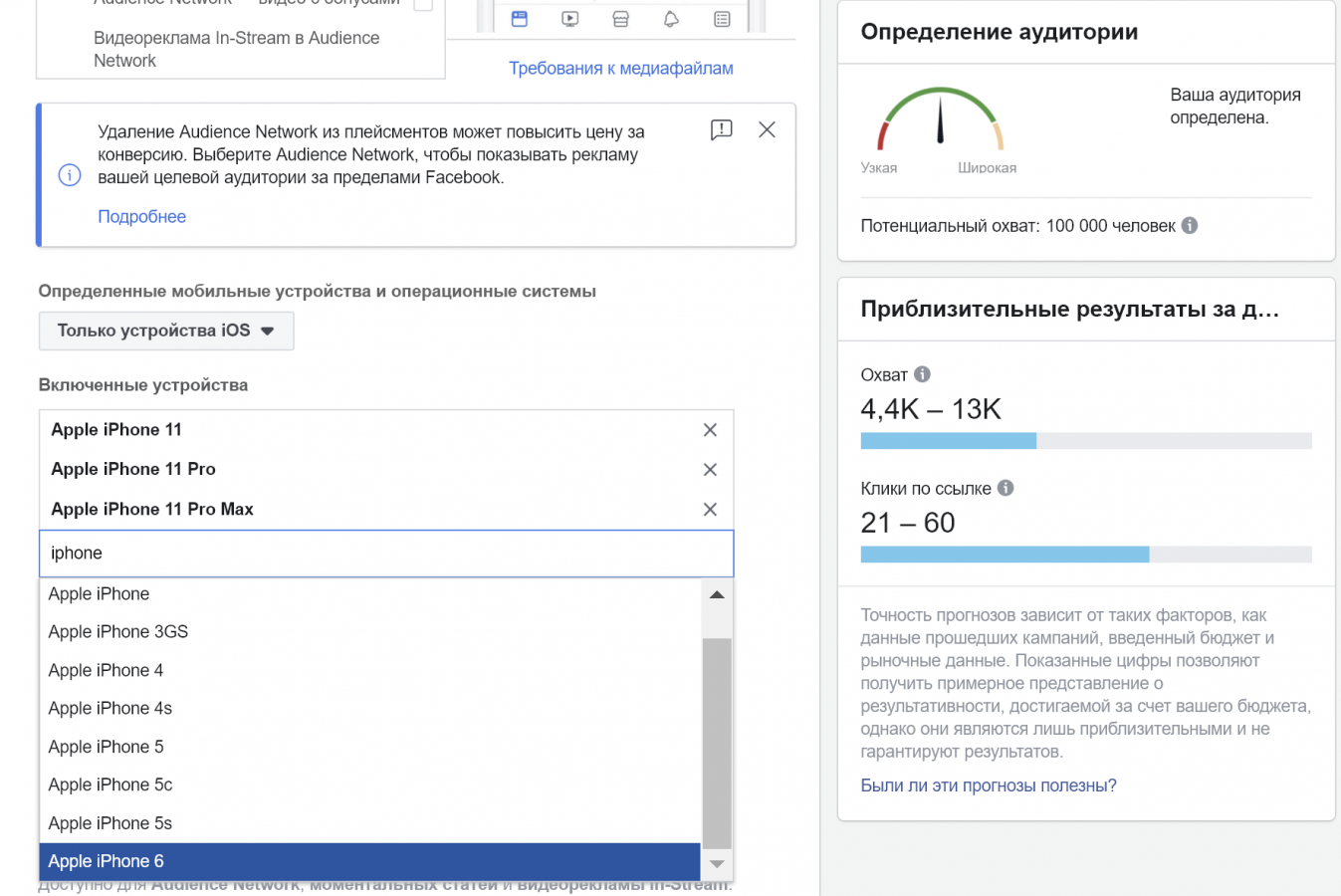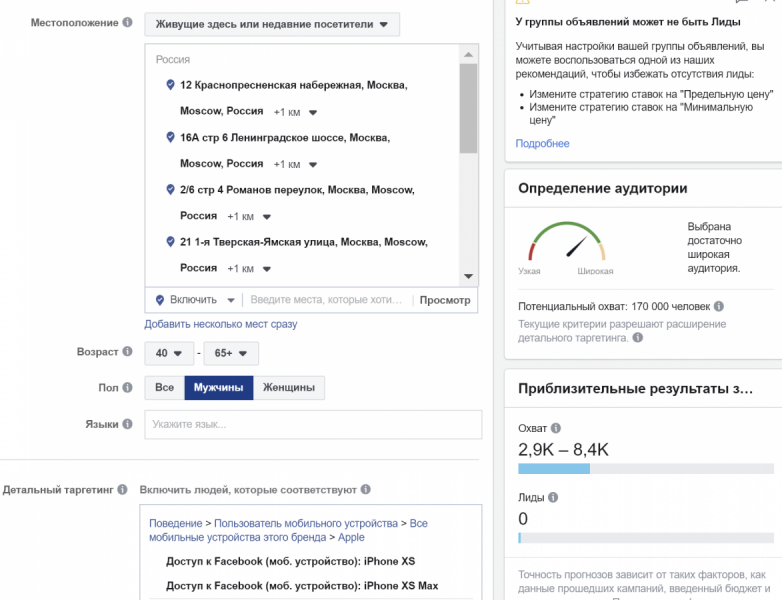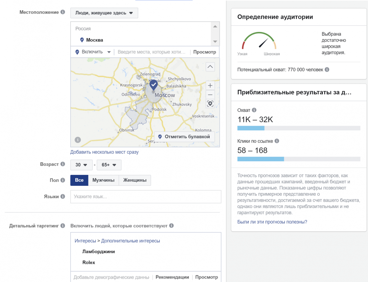 В примере выше Facebook нашел среди своих пользователей на текущий момент 100 тыс. мужчин 35+ лет, живущих в Москве, пользующихся последними моделями IPhone.