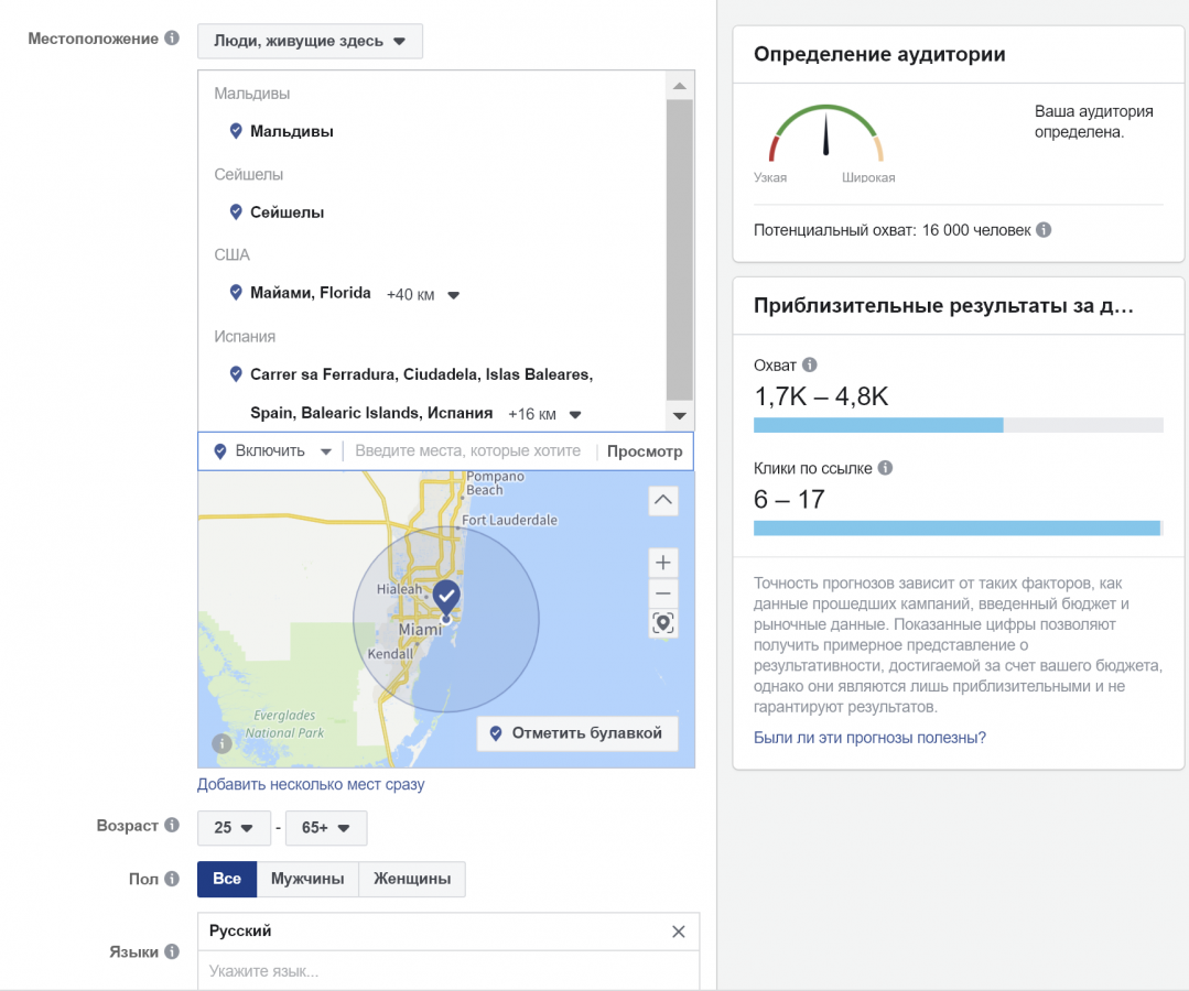 Например, по версии Travel and Adventure, самым дорогим курортом мира признан испанский остров, окруженный Средиземным морем, Са Феррадура (Sa Ferradura). И Facebook позволит нам старгетироваться на это местоположение. А еще мы можем задать таргетинг на Мальдивы, Сейшелы, Майами. Далее список зависит только от вашего видения мест отдыха вашей ЦА.