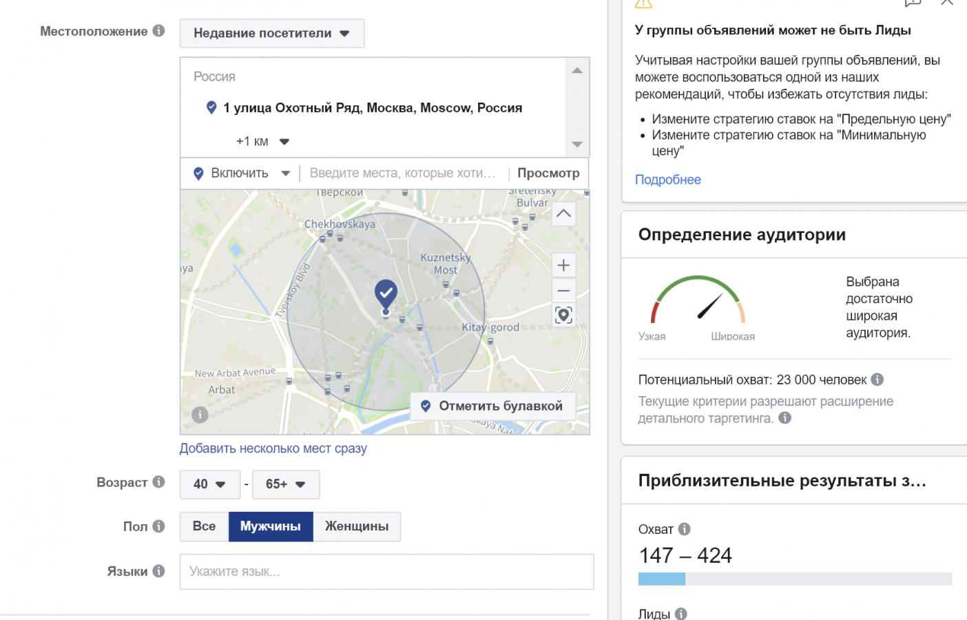 На нашем опыте именно таким способом мы смогли привлечь топ-менеджера компании «Роснано», который впоследствии приезжал на показ на объект клиента. Кстати, так как в ЦА покупателей премиум- и элит-классов входят и чиновники и депутаты, то неплохой идеей может быть старгетировать рекламу на адрес Государственной думы, страгетировав рекламу на Охотный ряд, д. 1. Facebook находит 23 тыс. мужчин в возрасте 40+, которые недавно побывали в этой локации.