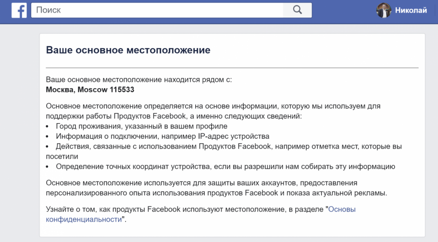Кстати, вы можете посмотреть, что за местоположение Facebook определил именно вашим домом в тех же настройках — разделе «Основное местоположение».