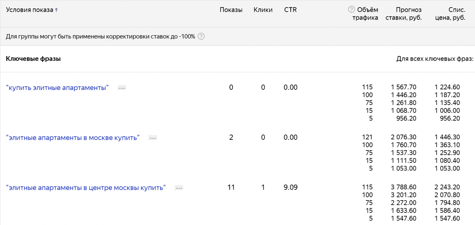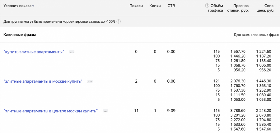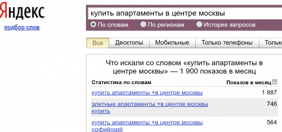 Она может давать самые «горячие» обращения клиентов. Но не стоит забывать об узком спросе пользователей. Например, запрос «купить апартаменты в центре Москвы» и все входящие в него запросы набирают всего 1900 раз в месяц.