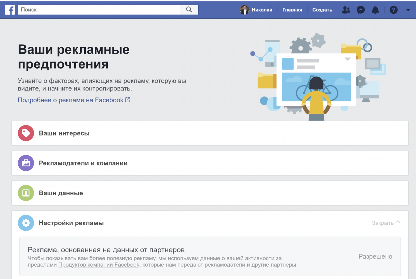 Если вы перейдете в раздел «Настройки» в Facebook и в левом пункте меню выберете пункт «реклама», то вы попадете в раздел «Рекламные предпочтения».