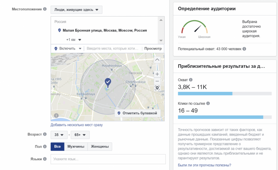 Не забываем наложить корректный возраст, например, 35+ лет. Встроенный в Facebook оценщик-калькулятор аудитории показывает нам размер аудитории, которую он идентифицирует среди своих пользователей для данных параметров. Как мы видим на скриншоте выше, мы сможем показать нашу рекламу 43 тыс. человек в возрасте от 35 лет, живущим в радиусе 1 км от улицы Малой Бронной.