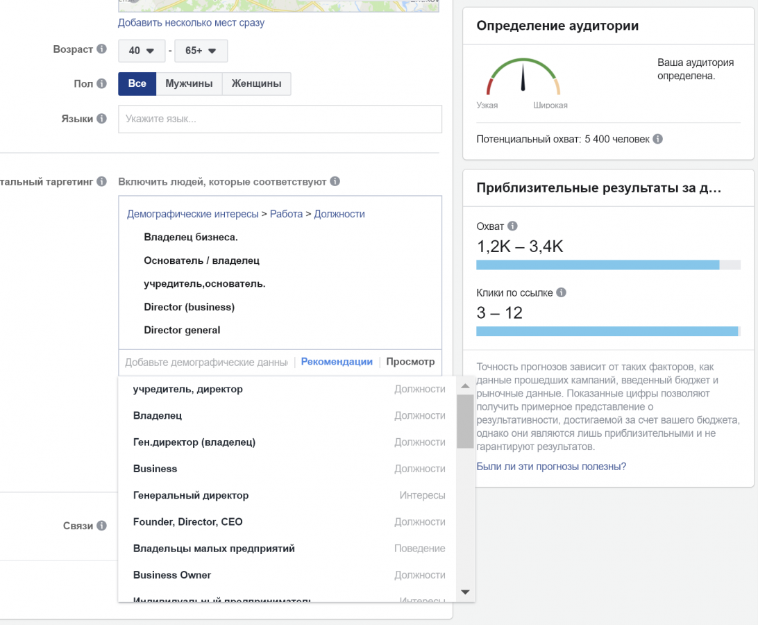 Количество таких пользователей невелико, но они ценны для нас в поиске потенциальных клиентов. Представитель нашей ЦА занимает позицию топ-менеджера или владельца компании. Выбрав все релевантные должности, например, CEO, CMO, Owner, General Director, и, опять же, добавим дополнительно пол — мужской, возраст 40+. В итоге мы получаем потенциальную аудиторию с высоким доходом.