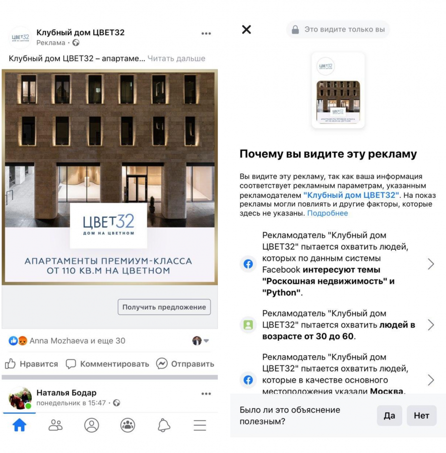 Покупатель премиум-класса обычно уже имеет квартиру, а часто и не одну. И большая часть представителей нашей ЦА уже живет в премиальных районах Москвы. Facebook четко умеет определять, где пользователь постоянно живет по его геолокации. И именно не часто бывает, например, в кофейне в центре города, а постоянно логинится в Facebook / Instagram на протяжении многих дней подряд, в том числе ночью.