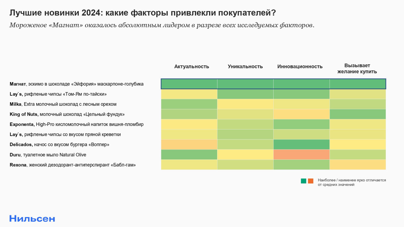 Благодаря дополнительной оценке покупателей в рамках опроса удалось не просто составить рейтинг лучших запусков FMCG за 2024 год, но и выявить, за что конкретно покупатели любят тот или иной товар. К примеру, по критерию инновационности ярко выделяются не только лидер списка «Магнат», но и кукурузные чипсы Delicados со вкусом бургера «Воппер», кисломолочный напиток Exponenta High-Pro с вишней и пломбиром или дезодорант Rexona с запахом «Бабл-гам». А вот туалетное мыло Duru Natural Olive расценивается как менее инновационное, но зато занимает второе место по критерию актуальности — то есть наибольшее число покупателей говорят о том, что для них актуален этот товар.