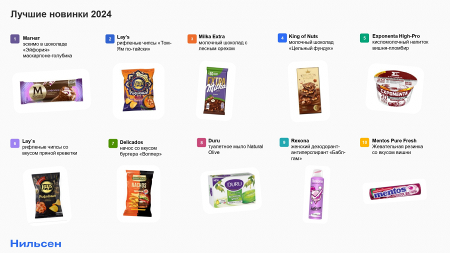 В топ-3 прорывных запуска 2024 года вошли мороженое «Магнат Эйфория» с маскарпоне и голубикой, чипсы Lay’s со вкусом «Том-Ям» и молочный шоколад Milka Extra с лесным орехом. В пятерку также попали молочный шоколад King of Nuts с цельным фундуком и кисломолочный напиток Exponenta High-Pro с вишней и пломбиром. Далее в списке следуют чипсы Lay’s со вкусом пряной креветки, начос Delicados со вкусом бургера «Воппер», мыло Duru Natural Olive, женский дезодорант-антиперспирант Rexona «Бабл-гам» и жевательная резинка Mentos Pure Fresh со вкусом вишни.