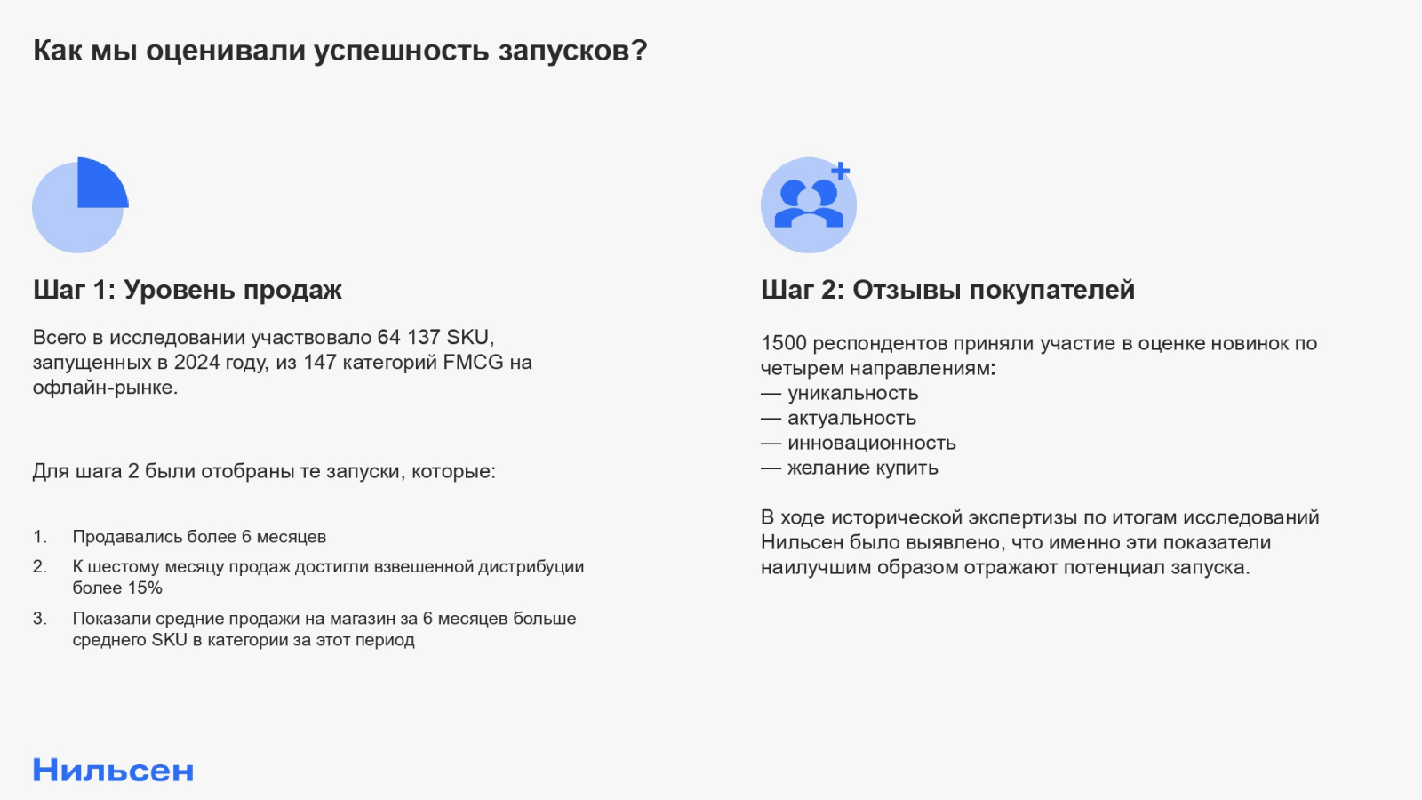 В топе оказались SKU, которые с точки зрения продаж соответствовали трем критериям: новинки продавались больше полугода в 2024 году, к шестому месяцу продаж достигли взвешенной дистрибуции свыше 15% на уровне всей России, а также показали средние продажи на магазин за шесть месяцев больше среднего SKU в категории. После прохождения фильтров в числе претендентов оказались около 150 SKU из вышедших 64 тыс. новинок на рынке.