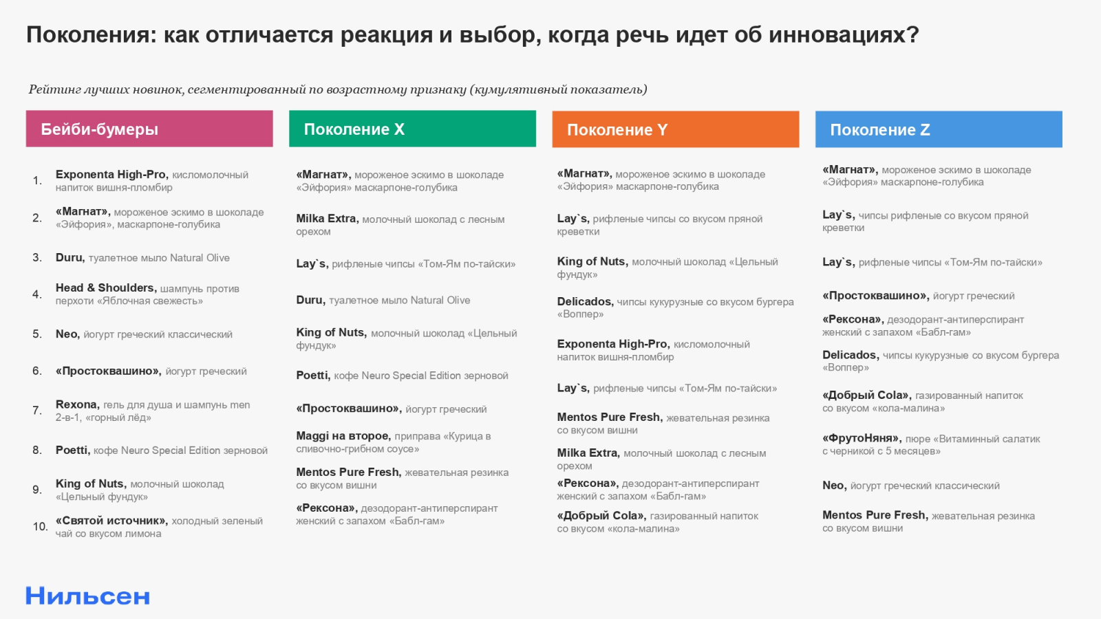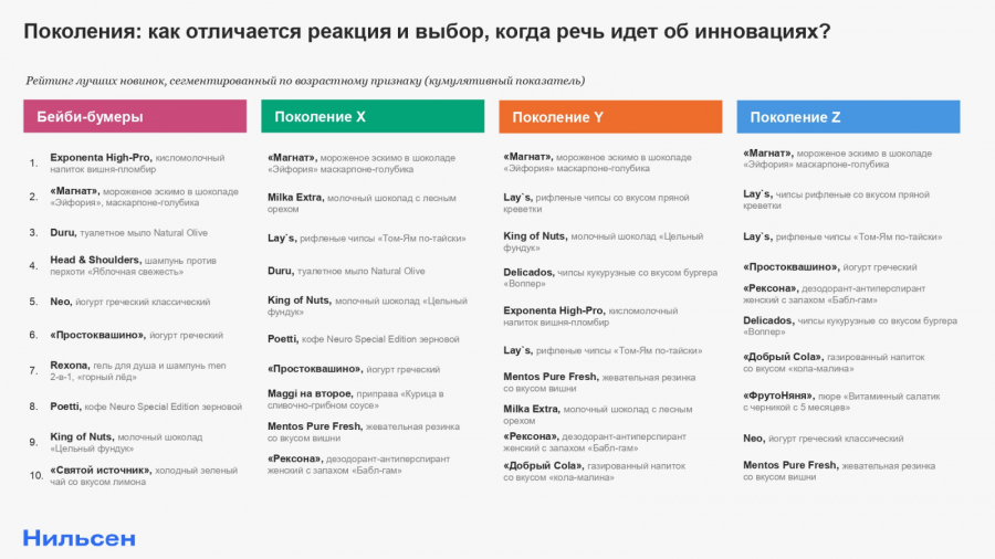 У каждого поколения есть свои специфичные черты потребления и те критерии, за которые покупатели любят новинку. Это особенно заметно при рассмотрении топ-3 товаров для каждой возрастной группы: верхние строчки рейтинга среди беби-бумеров занимают кисломолочный напиток Exponenta с вишней и пломбиром и мыло Duru Natural Olive, которые не входят в тройку у остальных респондентов. Поколение X выделяет шоколад Milka Extra с лесным орехом, а поколение Y — шоколад King Of Nuts.