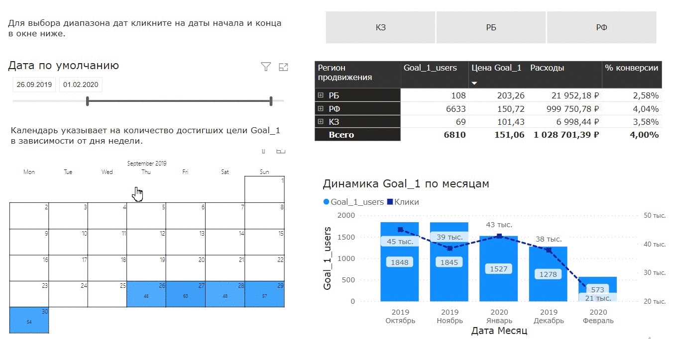 По итогам первого месяца был сформирован отчёт в Power BI. Он включал агрегированную статистику по двум рекламным системам, результаты по достижению основных и промежуточных целей, рекомендации и планы по развитию кампании.