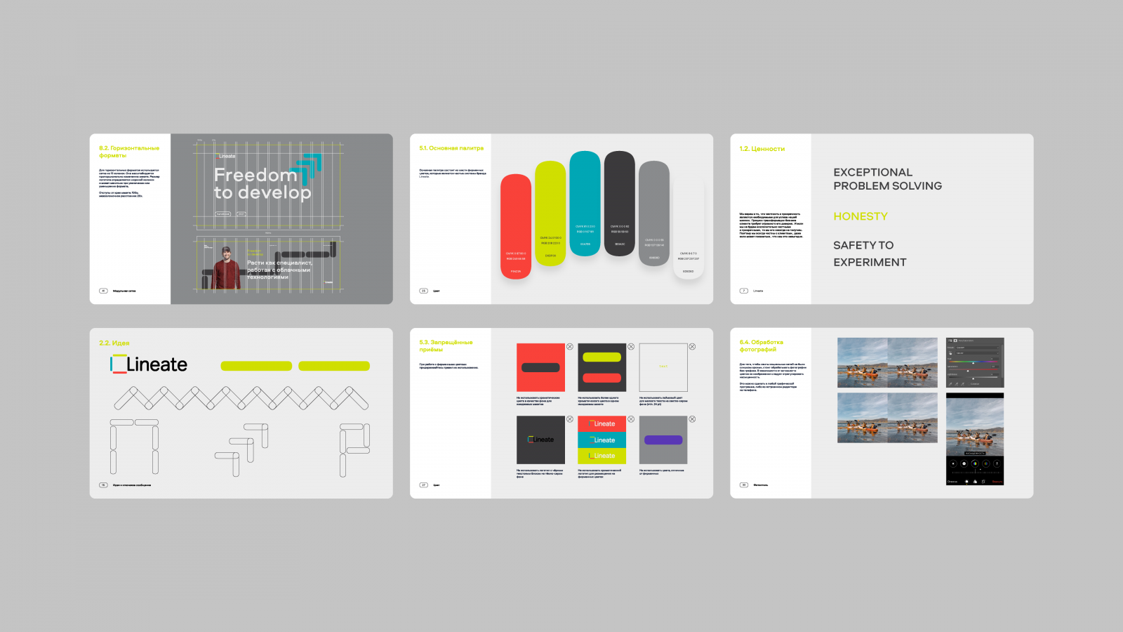 Для работы с фирменным стилем Lineate дизайнеры Nimax подготовили руководство, в котором описали технические правила использования айдентики, а также составили техническое задание на фотосъёмку команды.