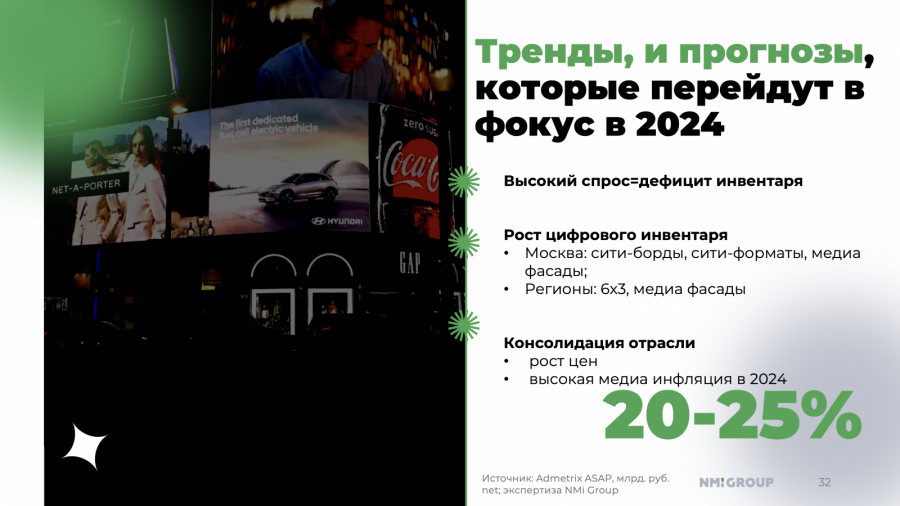 В 2024 году в отрасли идёт курс на консолидацию, из-за чего растут цены, и прогнозируется высокая медиаинфляция. По оценкам NMi Group, она составит 20−25%. Такой прогноз группа представила на встрече с журналистами.