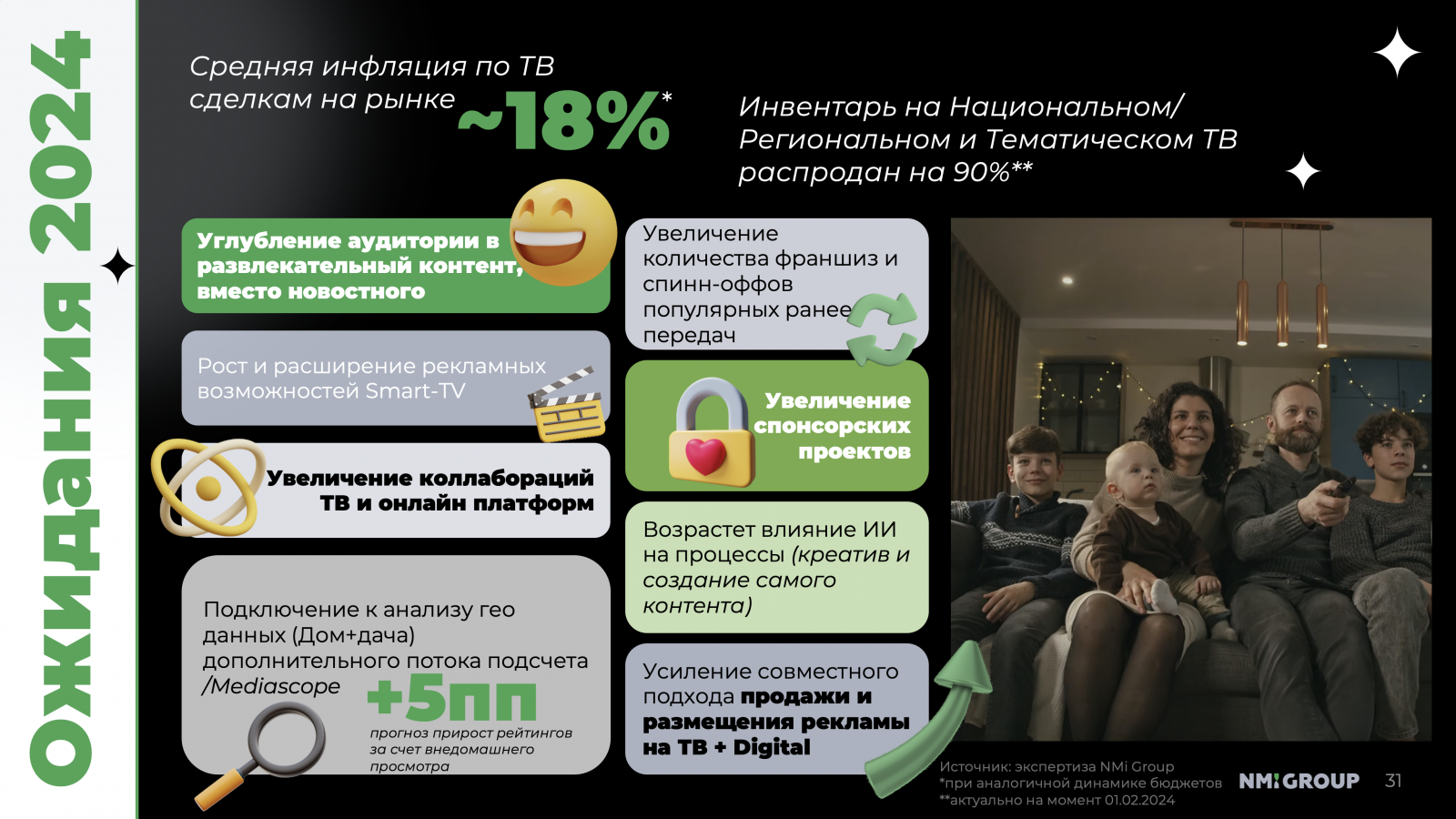 Средняя инфляция по сделкам на телевидении на рынке будет примерно на уровне 18%, отметили в группе. При этом по состоянию на 1 февраля инвентарь на национальном/ региональном и тематическом ТВ распродан на 90%. Среднерыночная инфляция распространится на сделки, заключённые до 1 декабря 2023 года, имеющие значительный рост бюджета год к году, как поканально, так и по тотал-бюджету сделок. Сделки, заключённые позже или не имеющие достаточный рост бюджета, могут иметь инфляцию более 40%