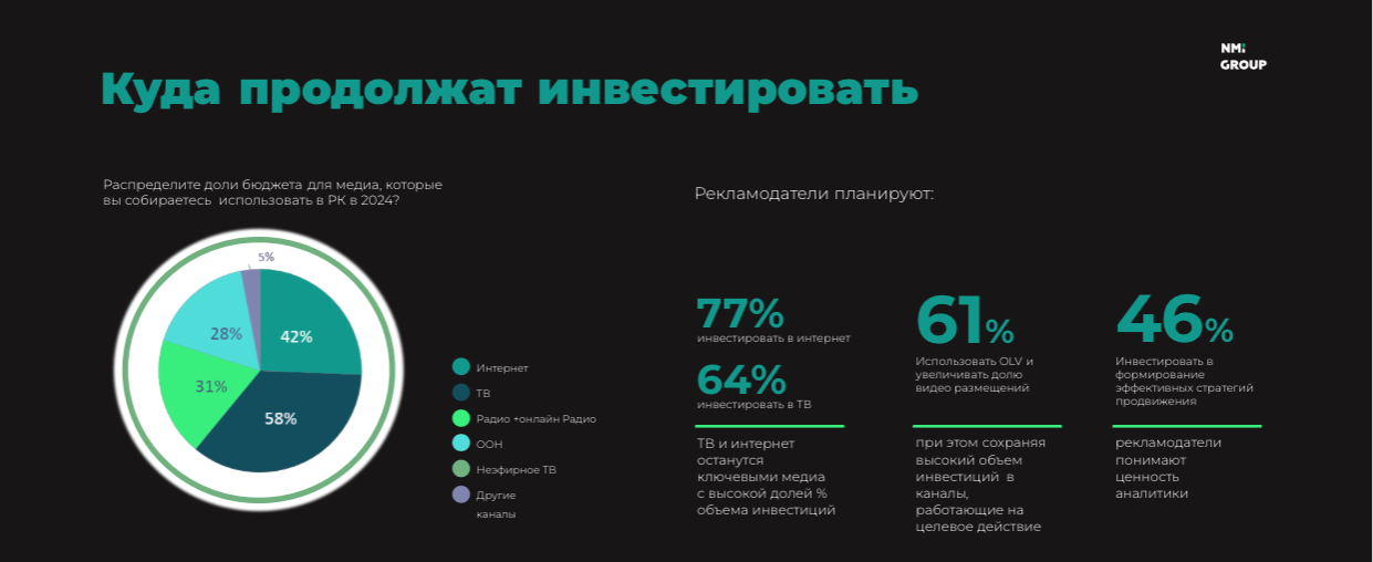 Рекламодатели будут вкладываться в интернет (такое мнение высказали 77% опрошенных), телевидение (64%), формирование эффективных стратегий продвижения (46%). 61% будет использовать OLV и наращивать долю видеоразмещений.