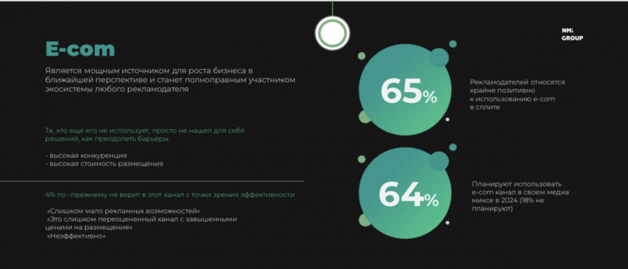 В ближайшей перспективе, по словам эксперта, мощным источником для роста бизнеса станет электронная коммерция. 65% рекламодателей положительно относятся к применению e-commerce в сплите. 64% хотят использовать e-com канал в своём медиа-миксе в следующем году.