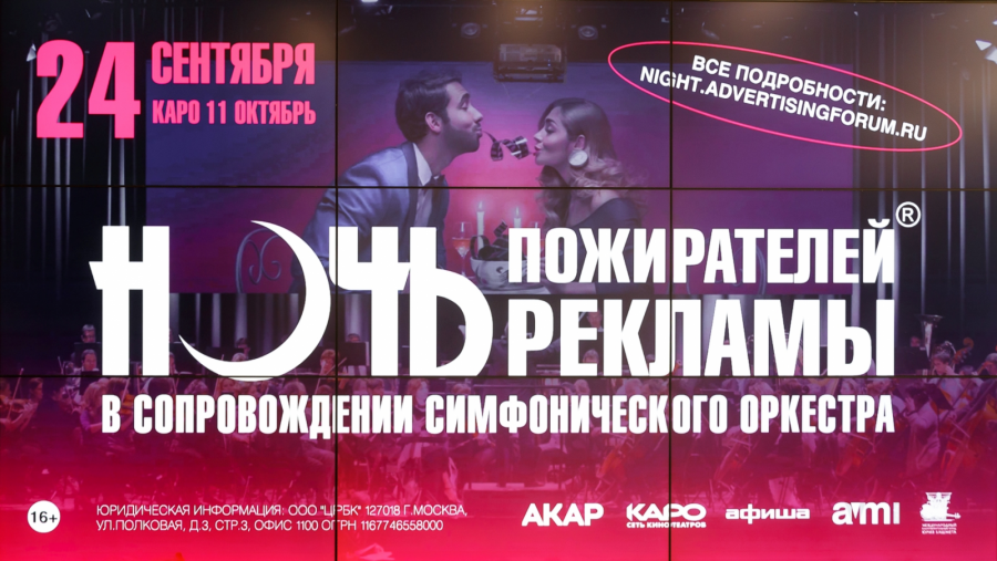 В АКАР подвели итоги прошедшей 24 сентября «Ночи пожирателей рекламы». Кинопоказ культовых рекламных роликов в сопровождении симфонического оркестра получил статус мировой премьеры и стал фееричным завершением деловой программы юбилейного Национального рекламного форума (НРФ).