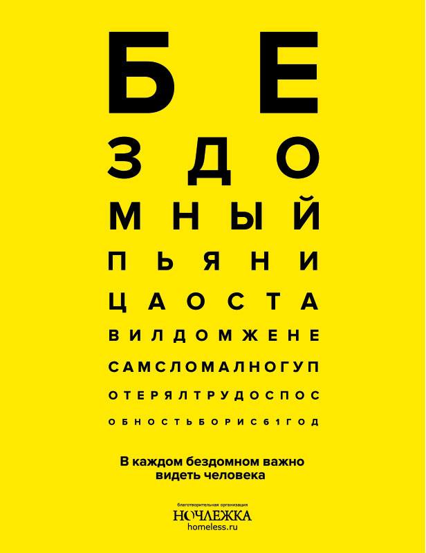 Семь реальных историй бездомных людей, стилизованных под офтальмологические таблицы, можно увидеть на улицах города — как и подопечных «Ночлежки». Только прочитав надпись до последней буквы, можно узнать историю полностью. В итоге бродяга, алкаш и старуха оказываются людьми с трудными судьбами. Рекламу бесплатно размещают газета «Ведомости», а также операторы Poster и «Реклама-Центр». Работа Action тоже была безвозмездной.
