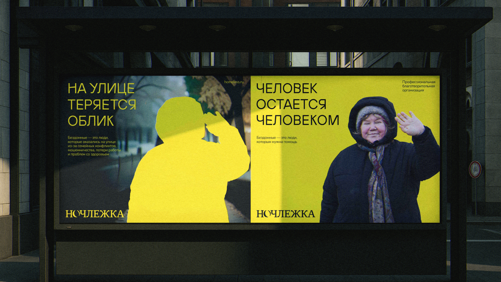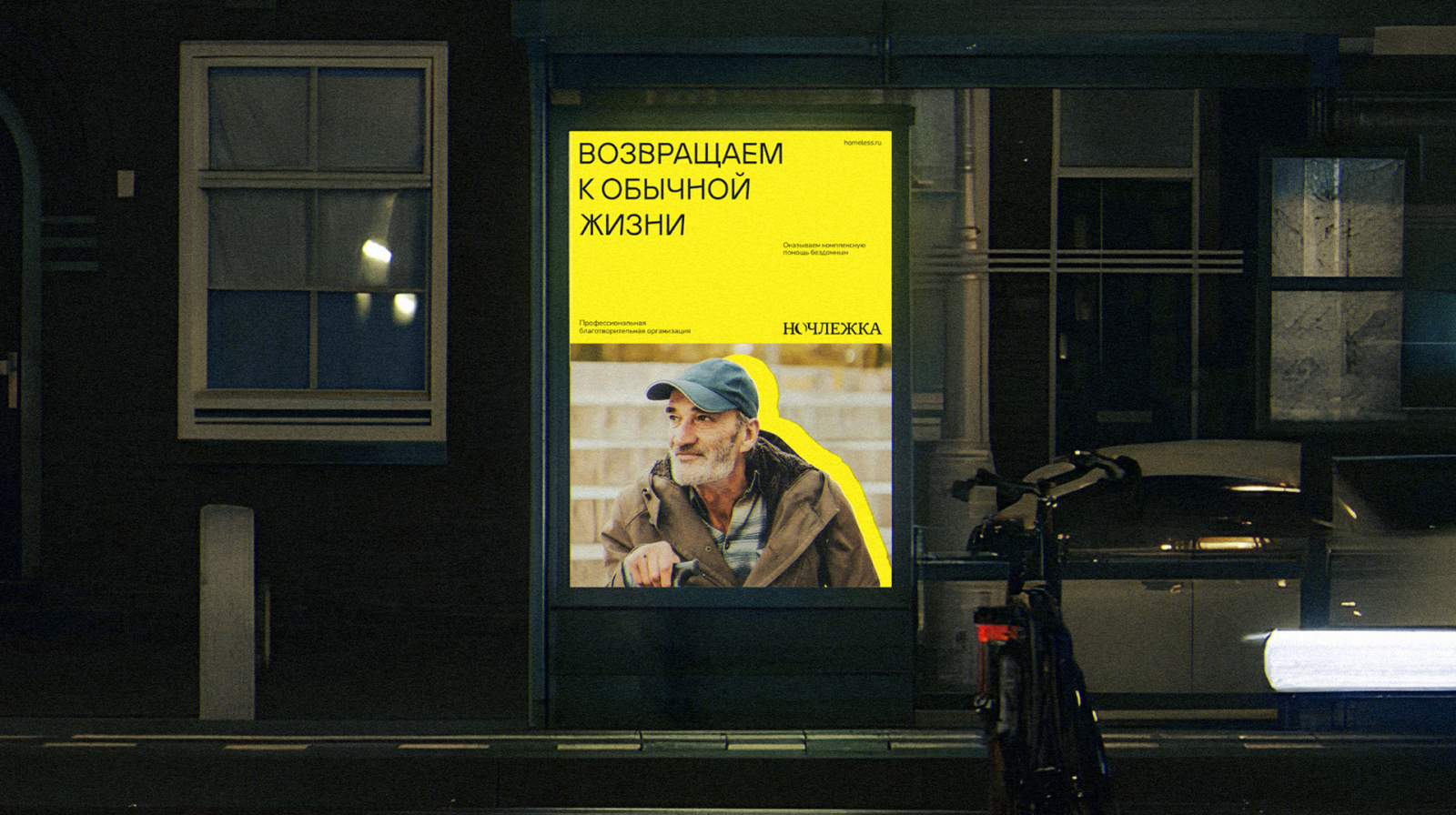 Через сдвиг и смещение изображения мы показываем, что за внешним образом бездомного стоит его прошлое. «Ночлежка» помогает вернуться на привычное место. Кастомный «покосившийся» шрифт — визуальный образ уязвимости. Он чуть наклонён и неустойчив — как человек, потерявший равновесие, опору.