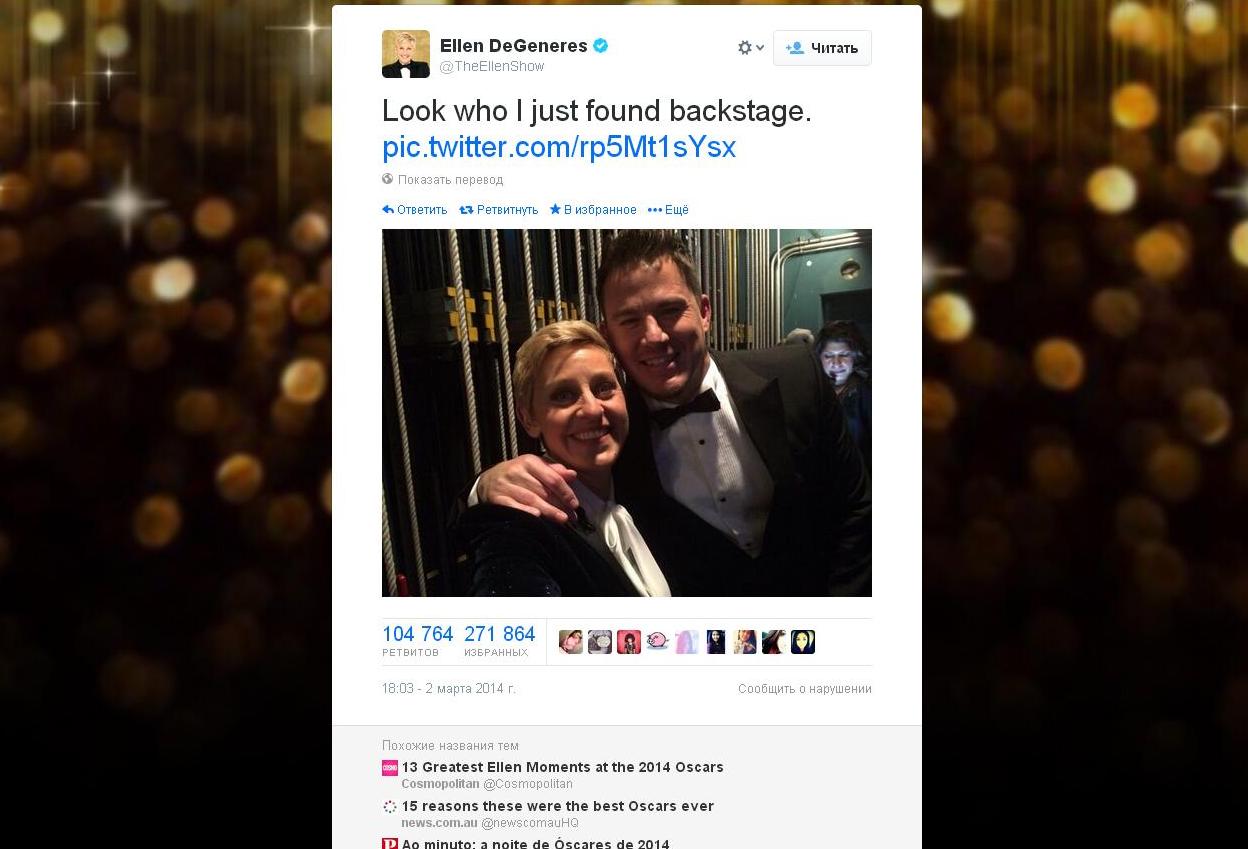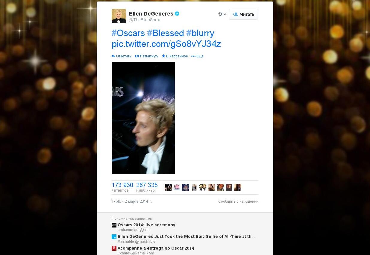 Дело в том, что снимок ведущая сделала с помощью смартфона Galaxy Note 3 компании Samsung, выступившей в роли генерального спонсора церемонии. Несмотря на то, что полученное фото было не слишком хорошего качества, Эллен Дедженерис выложила его в Twitter с хэштегами Oscars, Blessed и blurry («размазанный»).