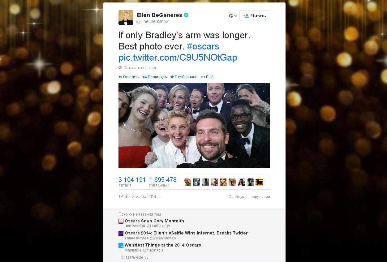 Спустя некоторое время Эллен Дедженерис опубликовала еще один качественный селфшот, сделанный уже с помощью смартфона Samsung. Позже этот снимок с голливудскими звездами набрал рекордное за всю историю сервиса микроблогов количество ретвитов.