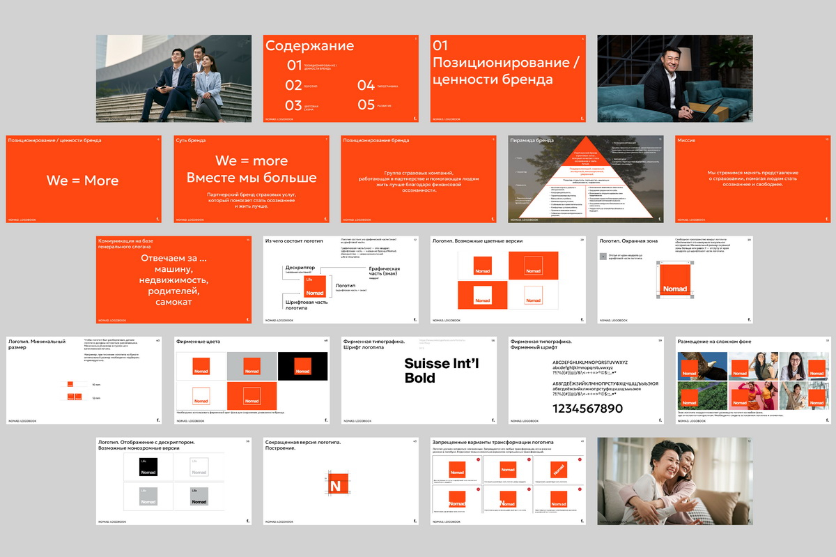 Работа над позиционированием началась с определения ценностей бренда: развитие, открытость, партнёрство, инновации, амбициозность и патриотизм. Смыслы, заложенные в эти понятия, помогли сформулировать миссию: «Nomad — это группа компаний, которая меняет представление о страховании, помогая людям становиться осознаннее и свободнее». Так родилось объединяющее позиционирование We=More. Его суть проста: слаженная совместная работа всегда приводит к лучшему результату. Такой эффект называется синергией, объясняет Fabula Branding, и его можно описать с помощью метафорической формулы «1+1=3».