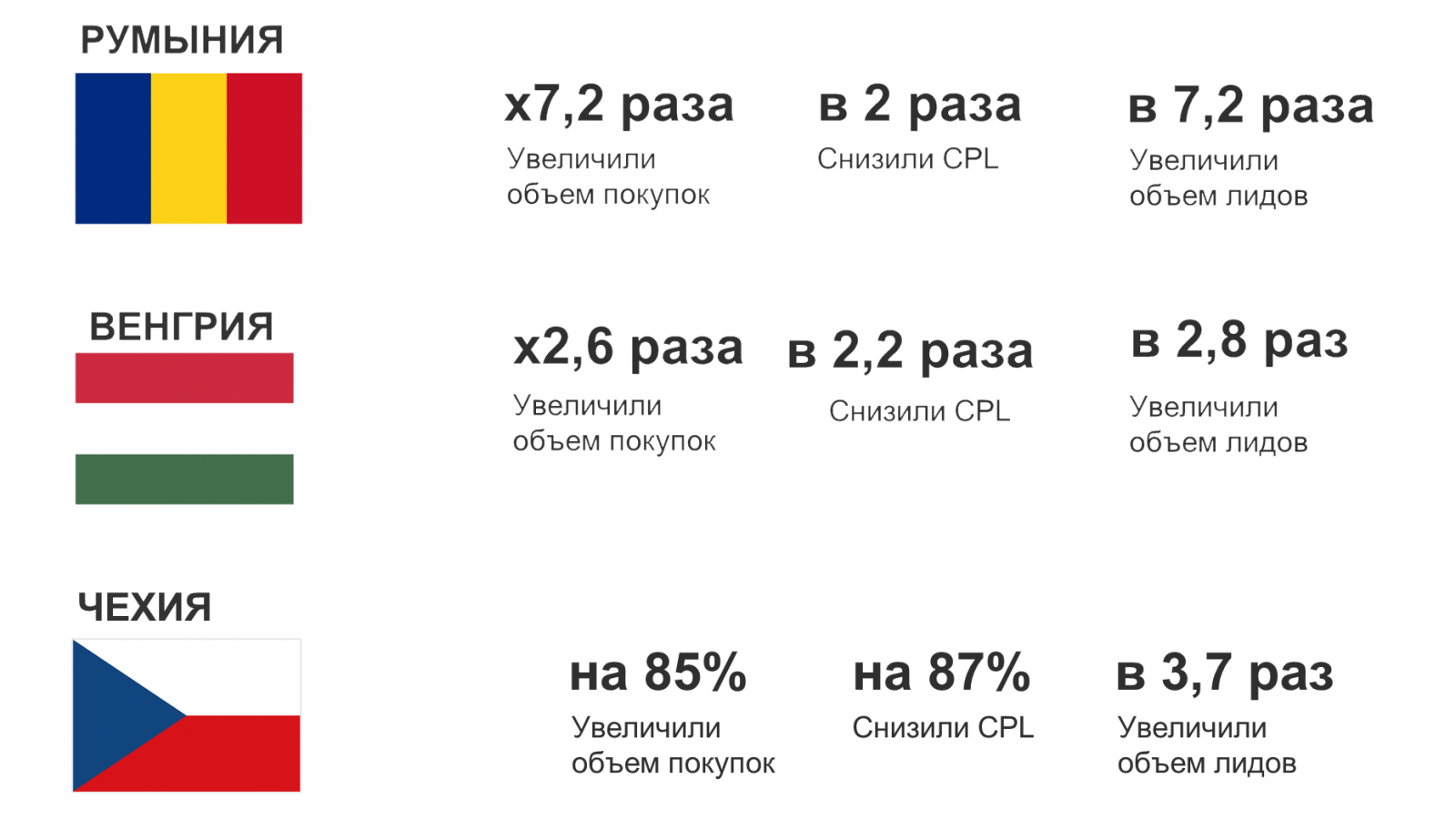 Например, в Румынии мы в 7,2 раза увеличили количество лидов и в 7,2 раза увеличили объем покупок. В Венгрии рекламная кампания принесла увеличила число лидов в 2,8 раз, а число покупок — в 2,6 раза.