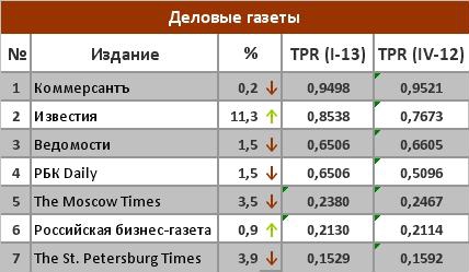 Особой популярностью пользовались статьи «Адагамову грозят уголовным делом и детектором лжи» (09.01.2013) – более 1500 ссылок и «Журналист «Новой газеты» задержан за грабеж» (16.01.2013) – более 1000 ссылок. В блоке деловых газет «Известия» «выросли» на 11,3%, однако этого не хватило, чтобы потеснить «Коммерсантъ», который находится на первом месте.