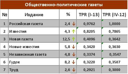 «Российская газета» и «Известия» сохранили первенство среди общественно-политических газет и являются безусловными лидерами, хотя «РГ» и потеряла 2,4%. Популярность материалов «РГ» в традиционных СМИ сократилась на 10%, но она улучшила показатели по размещению рекламы, аудиторному охвату и цитируемости в социальных медиа.