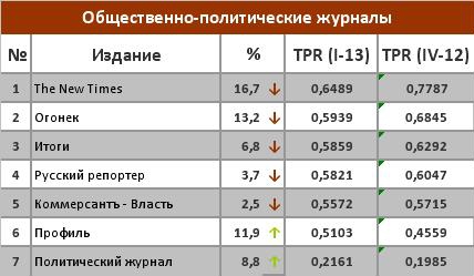 В сегменте общественно-политических журналов сдали позиции «Итоги» и «Русский репортер», которые пережили триумф в прошлом отчетном периоде, пропустив вперед «The New Times» и «Огонек».