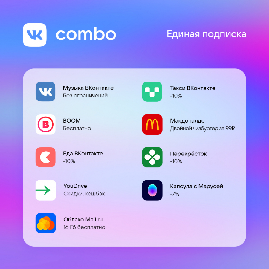 В новую подписку VK Combo входят «Музыка ВКонтакте», скидка 10% на доставку и такси в сервисах «Еда ВКонтакте», «Такси ВКонтакте», Delivery Club и «Ситимобил», дополнительные 16 Гб в «Облаке Mail.ru», скидка и кешбэк в YouDrive, а также скидка на умную колонку «Капсула». Кроме этого, пользователям будет доступна 10%-ная скидка в «Перекрестке» и скидка на двойной чизбургер в McDonald's.