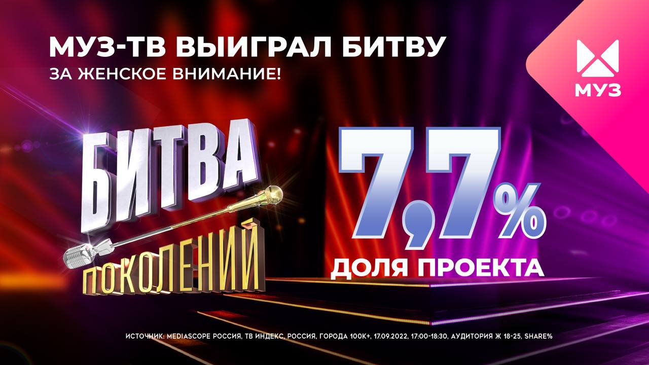 И хотя проект начал выходить в эфир лишь месяц назад, шоу уже показало высокие результаты в рейтингах. По данным Mediascope, доля телеканала «МУЗ-ТВ» во время премьерного показа «Битвы поколений» составила 3,24% (Все 18−44 в городах 100k+), что превышает среднегодовую долю канала на 116%. Рейтинг канала в слоте программы увеличился сразу на 231% по сравнению со среднесуточным рейтингом «МУЗ-ТВ» за 2022 год. Особенно премьера покорила аудиторию молодых девушек. «МУЗ-ТВ» с долей 7,7% (в три раза выше средней цифры канала за день в данной ЦА) вошёл в ТОП-5 всех федеральных каналов среди женщин 18−25 лет).
