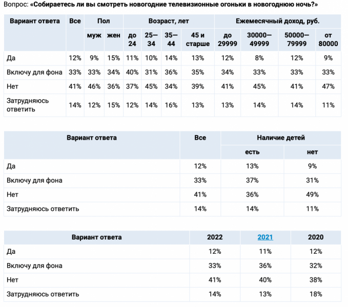 41% россиян не собираются смотреть телевизионные огоньки в новогоднюю ночь. 33% опрошенных включат развлекательные ТВ-программы для фона. Смотреть новогодние телепередачи 31 декабря планируют всего 12% респондентов. Опрос провели аналитики сервиса по поиску работы SuperJob, его результаты опубликованы на сайте компании.