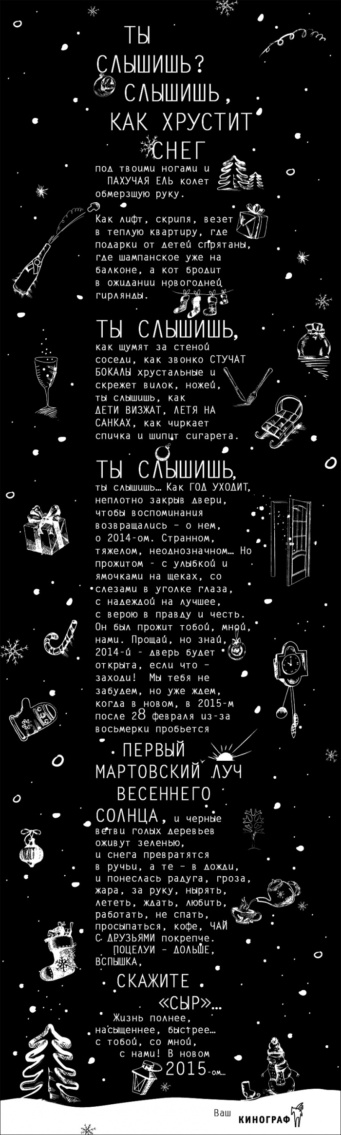 До Нового 2015 года остается совсем мало времени, и представители рекламной индустрии стремятся наиболее креативно и эмоционально поздравить коллег и клиентов с праздниками. Sostav.ru публикует наиболее интересные работы, которые, мы надеемся, поднимут нашим читателям настроение.
