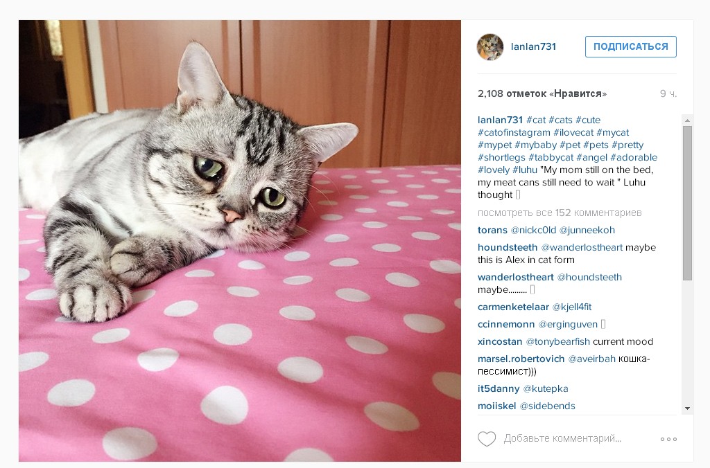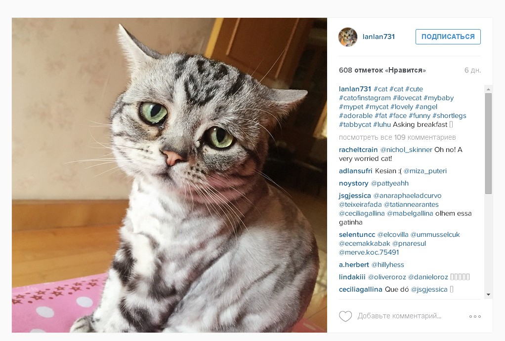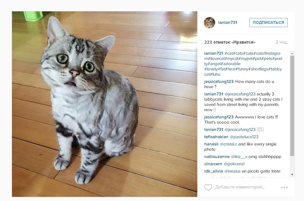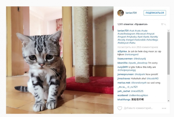 Кошка по имени Луху пополнила ряды домашних животных, вызывающих восторг у пользователей Сети. Из-за особого печального выражения морды Луху из Пекина получила прозвище кошка-пессимист. В своем аккаунте в Instagram хозяйка животного Мэгги Лю публикует преимущественно снимки Луху. В результате менее чем за месяц на ее страничку подписались более 25 тысяч человек.