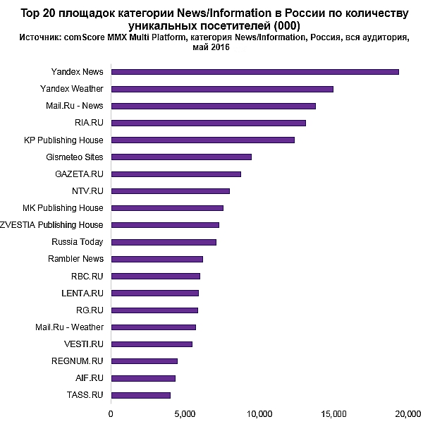 Общий размер digital аудитории в России в мае 2016 года составил 83,6 млн уникальных посетителей интернета с ПК и мобильных, включая смартфоны и планшеты. При этом, 62,2 млн россиян посещали площадки категории News/Information.