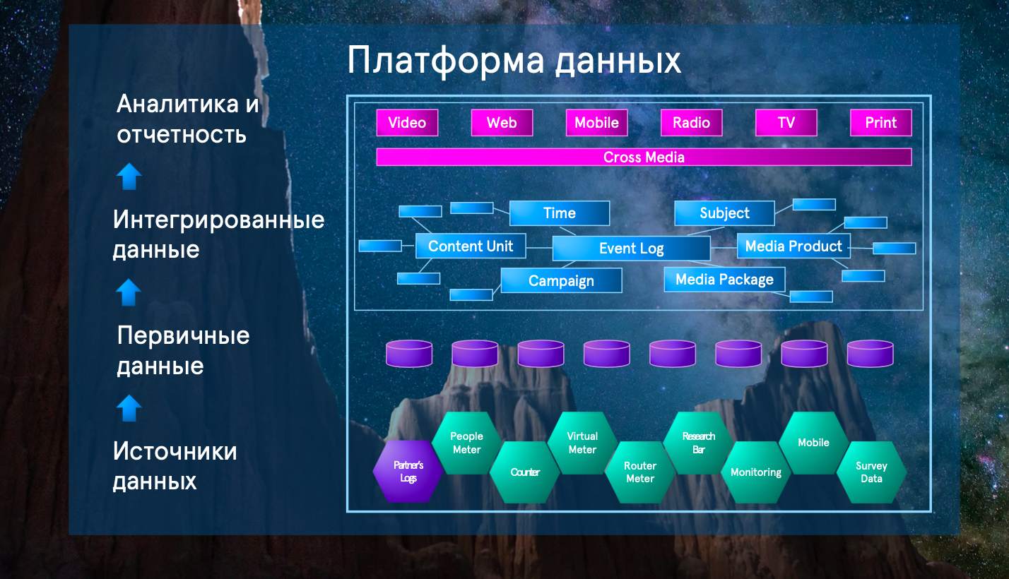 Компания переходит от концепции Market research к идеологии Data Science. Платформа позволяет собирать и обрабатывать в унифицированном виде большие массивы разнородных данных о контакте человека с медиа и рекламой и его потребительском поведении.