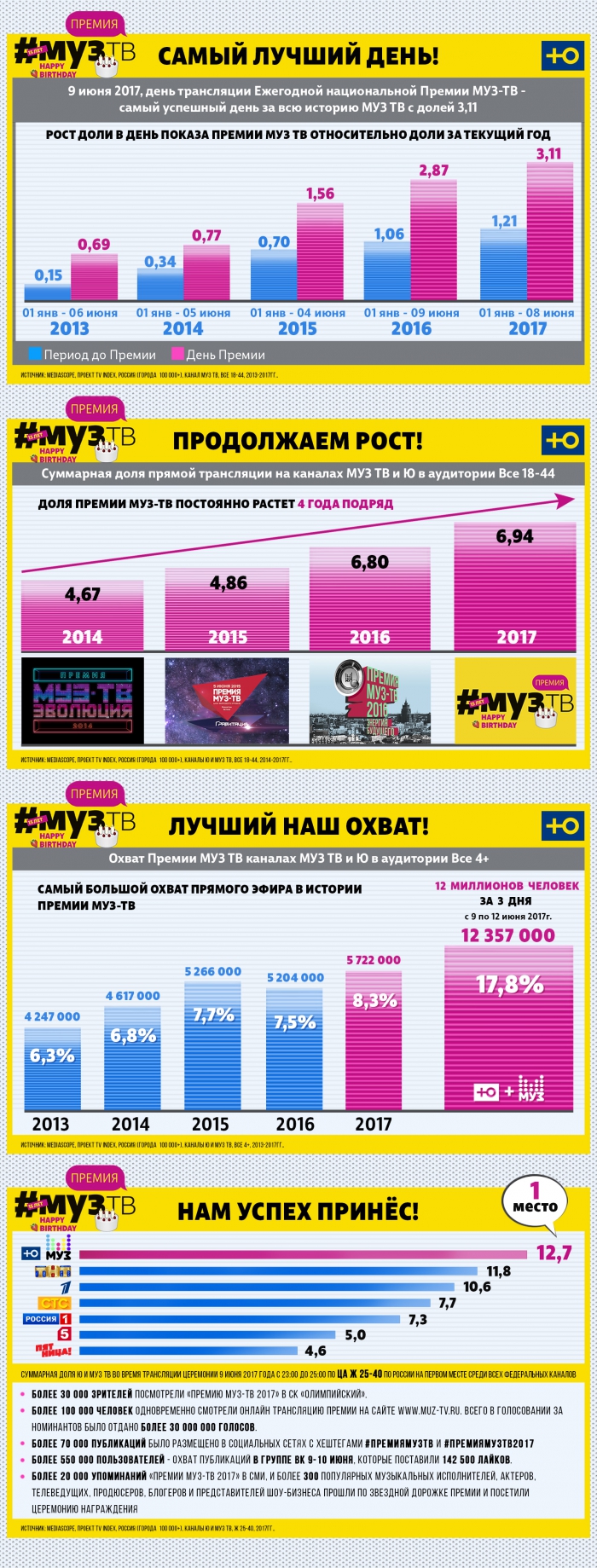 День показа Ежегодной национальной «Премии МУЗ-ТВ 2017» 9 июня 2017 года с долей 3,11* стал самым успешным за всю историю современного «МУЗ-ТВ». Суммарная доля прямой трансляции по женской целевой аудитории 25-40 на двух каналах ЮТВ Холдинга - «Ю» и «МУЗ-ТВ» составила 12,7 и принесла им первое место среди всех федеральных телеканалов**.