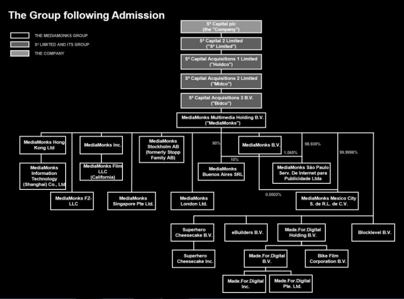 Вместе с MediaMonks в S4 Capital вошли компании Superhero Cheesecake, Bike Film Corporation, Made.for.Digital, ebuilders и Blocklevel. Крупнейшими акционерами S4 Capital являются Соррелл (18%), Toscafund Asset Management (13%) и Oro en Fools (12%).