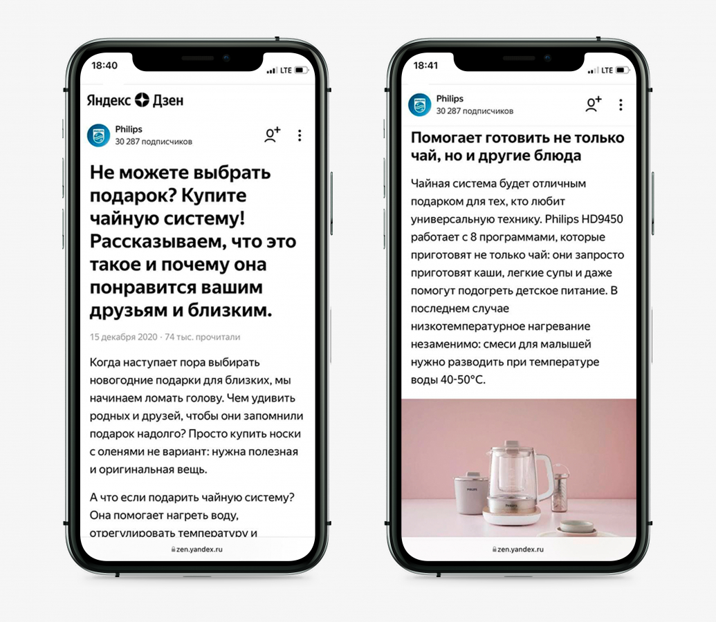 Команда придумала, как привлечь людей, которым чайная система вроде бы не нужна. Для этого в статье расписали необычные сценарии применения продукта: рассказали, что в ней можно быстро и удобно сварить кашу или легкий суп. В результате из специального гаджета для любителей чая система превратилась в универсальный кухонный прибор для каждого. Такой подход помог Philips собрать 74 тыс. дочитываний.