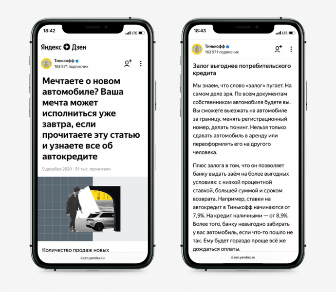 «Тинькофф» написал статью «Мечтаете о новом автомобиле? Ваша мечта может исполниться уже завтра, если прочитаете эту статью и узнаете всё об автокредите». В ней старались рассказать обо всех плюсах автокредита в сравнении с другими похожими продуктами.