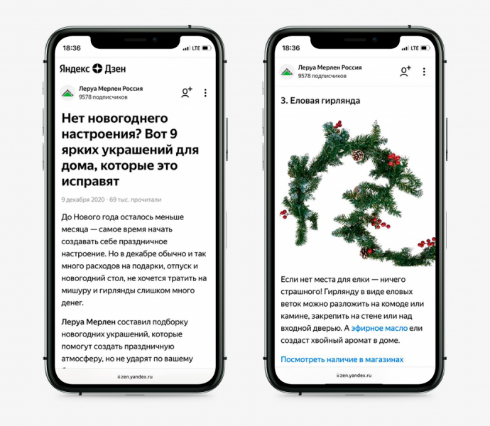 Компания «Леруа Мерлен» написала статью «Нет новогоднего настроения? Вот 9 ярких украшений для дома, которые это исправят». Команда предположила, что многие клиенты хотят украсить дом к празднику и не потратить на это много денег. Поэтому в рекламной статье «Леруа» сделана ставка на простые, бюджетные и красивые новогодние аксессуары для дома.