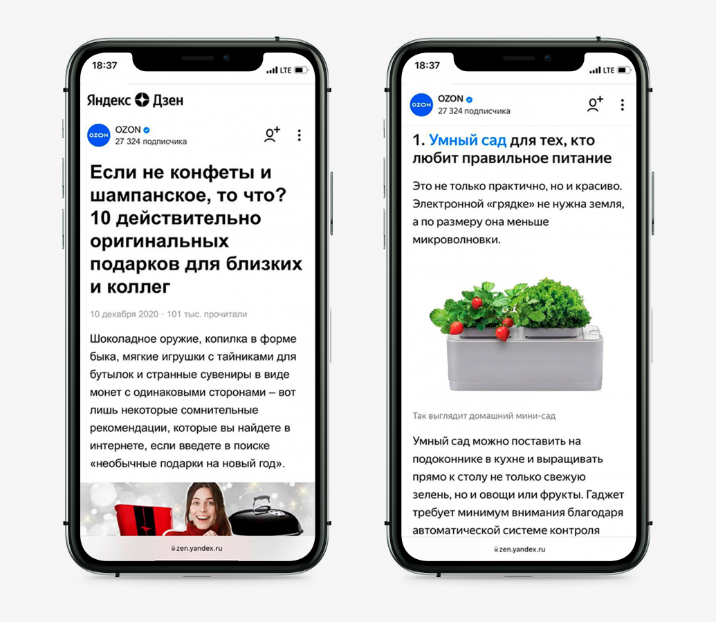 Ozon выпустил статью «Если не конфеты и шампанское, то что? 10 действительно оригинальных подарков для близких и коллег». Статью нацелили на самые распространенные типы клиентов: меломанов, спортсменов, любителей посмотреть кино под пледом. В ней привели примеры необычных подарков: например, рассказали про умную грядку для выращивания зелени на подоконнике и принтер для смартфона. В результате получился гайд по подаркам для читателей, у которых кризис идей. Статья собрала 101 тыс. дочитываний.