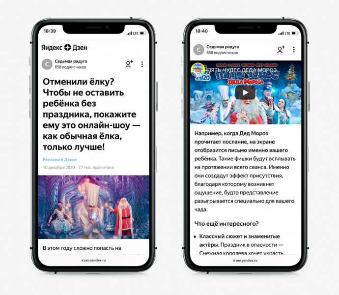 «Седьмая радуга» занимается постановкой новогодних шоу для детей. Когда количество людей на массовых мероприятиях ограничили, шоу перенесли в онлайн и сделали интерактивными. Чтобы рассказать о новом формате и привлечь клиентов, команда написала статью «Отменили ёлку? Чтобы не оставить ребёнка без праздника, покажите ему это онлайн-шоу — как обычная ёлка, только лучше!».