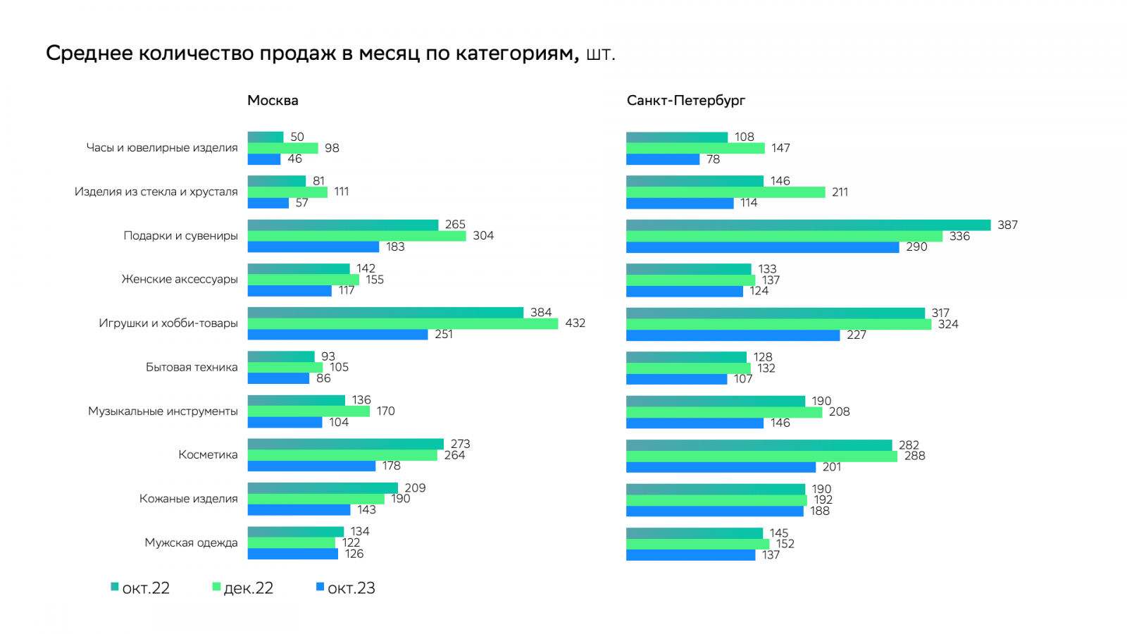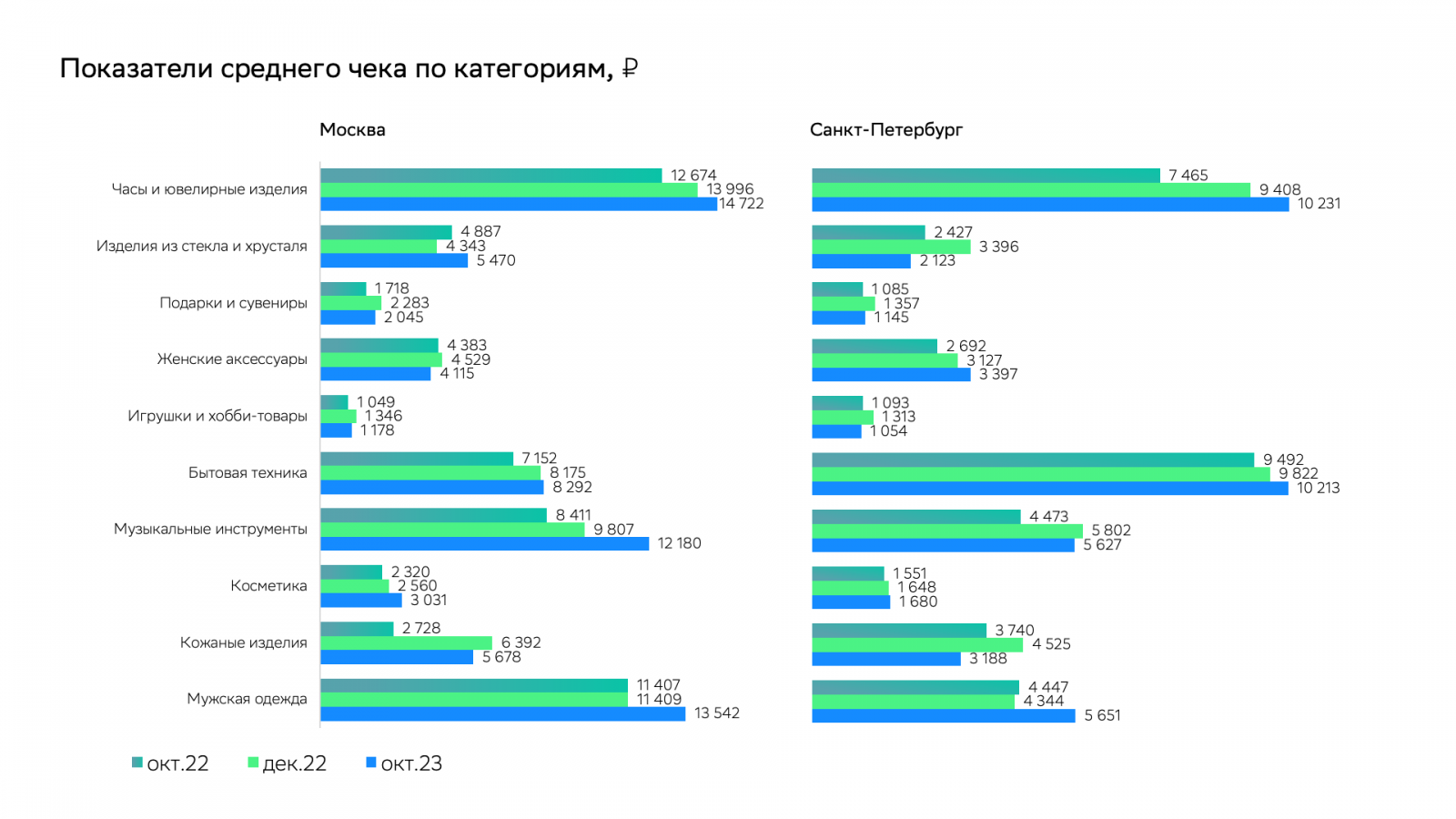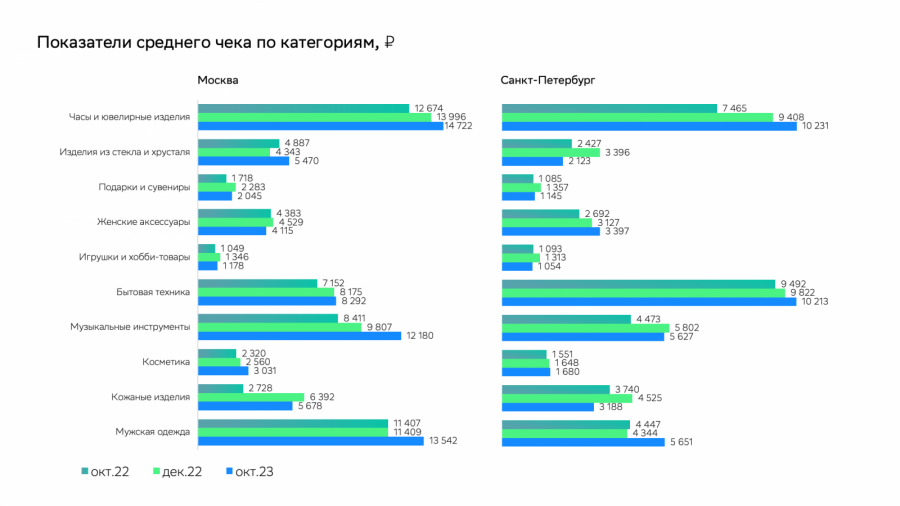 В некоторых категориях пиковые показатели среднего чека приходятся именно на декабрь: «Кожаные изделия» в обоих городах, «Изделия из стекла и хрусталя», «Подарки и сувениры», «Игрушки и хобби-товары», «Музыкальные инструменты» — в Санкт-Петербурге.