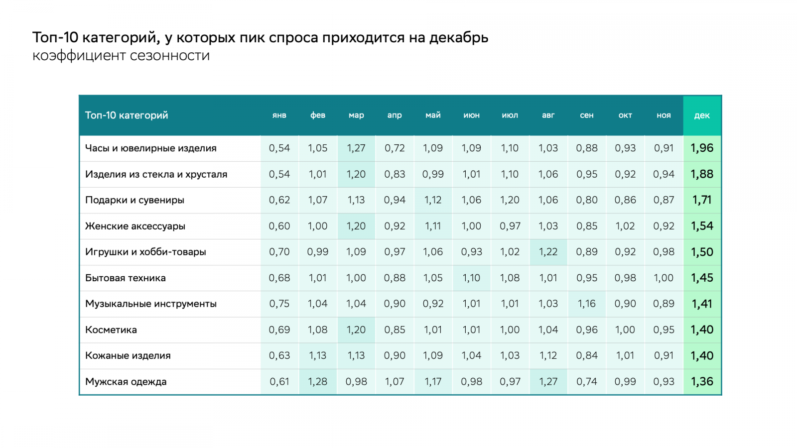 «СберТаргет» представил топ-10 категорий, у которых пик спроса приходится на декабрь. На первом месте в списке часы и ювелирные изделия. Второю строчку занимают изделия из стекла и хрусталя (посуда, лампы и абажуры, зеркала, картины, гончарные и керамические изделия). Тройку лидеров замыкают подарки и сувениры (поздравительные открытки, воздушные шары, праздничные украшения, оберточная бумага, банты и прочие канцелярские принадлежности). Исследование «СберТаргета» есть в распоряжении Sostav.